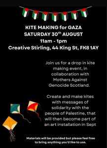 We hope you’ll join us on Saturday 30th August from 11am to 1pm at Creative Stirling Venue for a special workshop in collaboration with Mothers Against Genocide Scotland. This family-friendly kite-making session is free to attend, but booking is required to secure your spot.