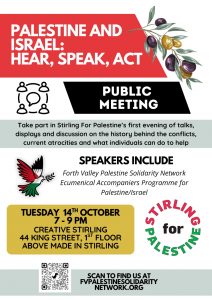 Take part in Stirling For Palestine’s first evening of talks, displays and discussion on the history behind the conflicts, current atrocities and what individuals can do to help.